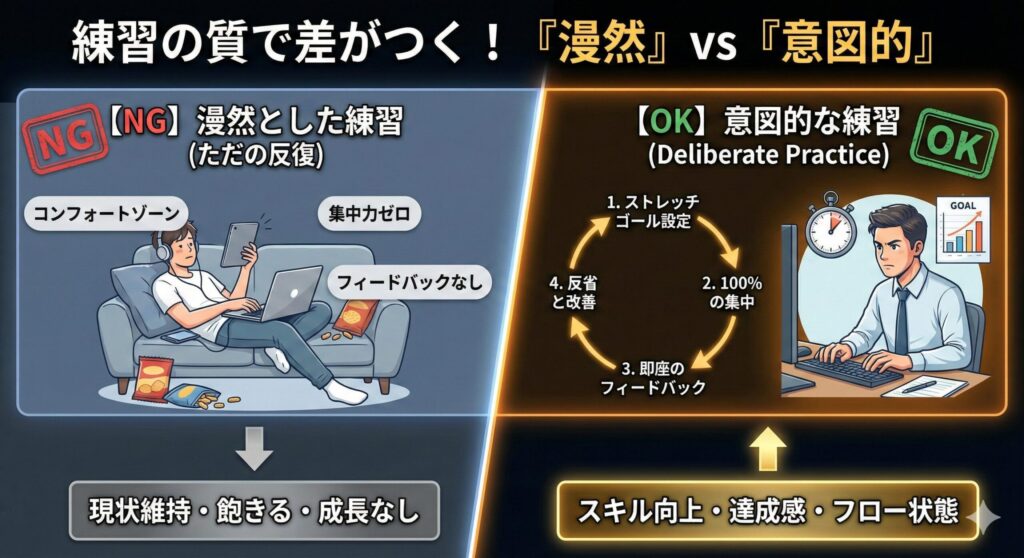 興味が定着してきたら、次は「粘り強さ」を鍛えるフェーズです。ここで多くの人が陥る罠が、「ただ同じことを漫然と繰り返す」ことです。